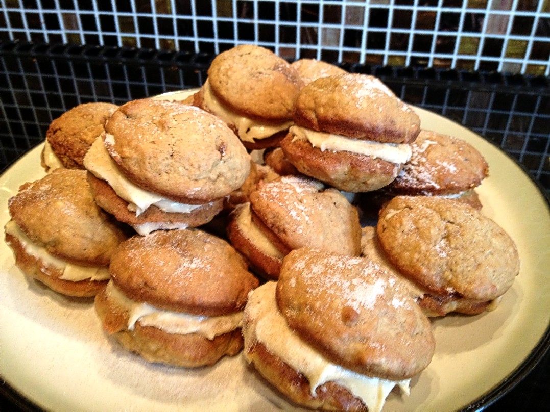 - For filling, beat together the filling ingredients and spread on half the cakes, sandwiching the others on top.