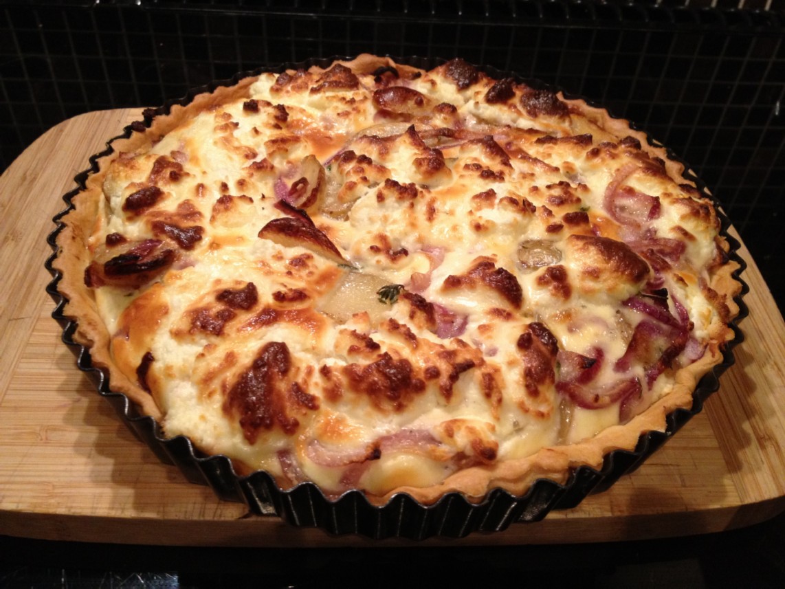 - Add garlic and thyme and season and cook for another 5 mins. Tip into pastry case with goat’s cheese.